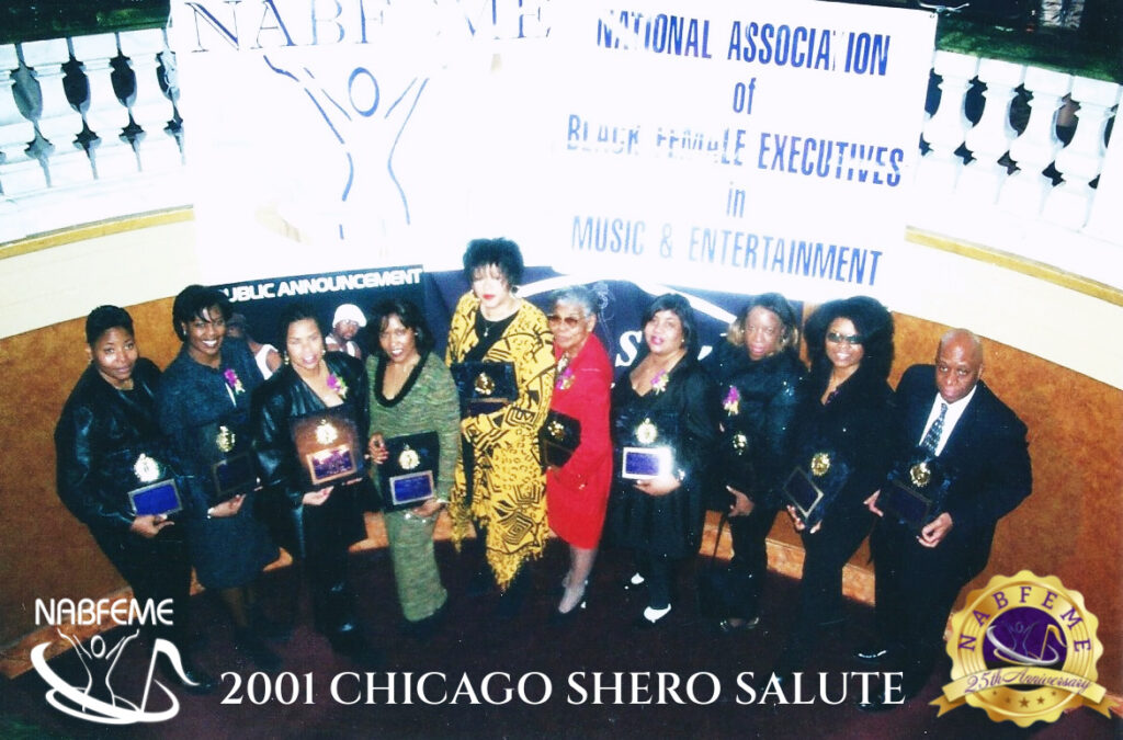 On January 14, 2001, at the School of the Art Institute of Chicago, NABFEME debuted the Chicago Shero Salute. Held during the holiday weekend honoring Dr. Martin Luther King, Jr., the event channeled his spirit of excellence to celebrate local “Sheroes”—women who played pivotal roles in the growth of the Chicagoland music and entertainment scenes.